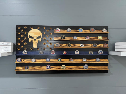 Thin Blue Line Punisher Coin Display Rack Holder - Rustic American Flag